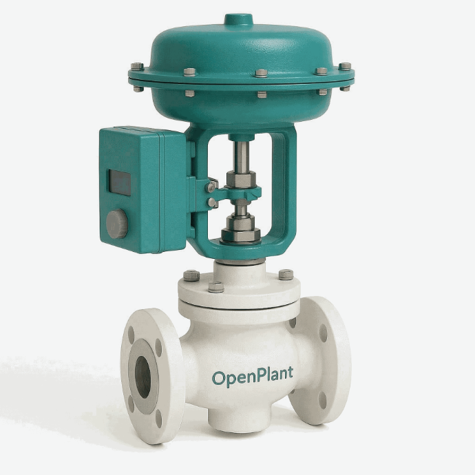 Válvula de control industrial OpenPLANT con actuador neumático de diafragma, cuerpo en acero inoxidable o carbono, y posicionador inteligente con señal 4-20mA + HART. Diseño compacto para regulación precisa de flujo, presión y nivel en procesos industriales. Opciones fail-close/fail-open, protección IP67.