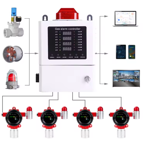 Ideal para medianas a grandes instalaciones industriales, admite hasta 99 detectores RS-485, alarma audible (> 90 dB), luz estroboscopica, salida de relay , comunicación a SCADA..