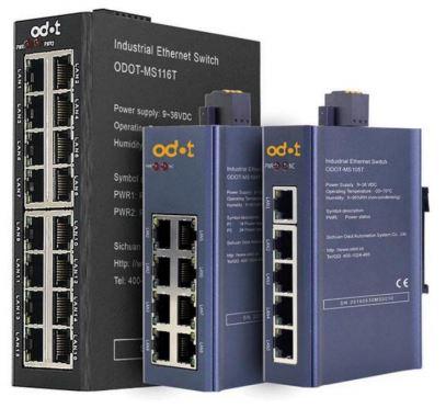 Switches industriales ODOT: Ethernet no gestionados, 5/8/16 puertos 10/100Mbps auto-negociación, compatibles IEEE 802.3/802.3u/802.3x. Alimentación 9-36V DC, montaje riel DIN 35mm, carcasa IP20. Operación -20°C a 70°C, protección anti-reversa, tormenta broadcast y ESD 2KV. Plug-and-play, ideales para automatización, IoT y redes industriales robustas. Garantía 3 años, integración sencilla con PLC, SCADA y sistemas OpenPLANT.